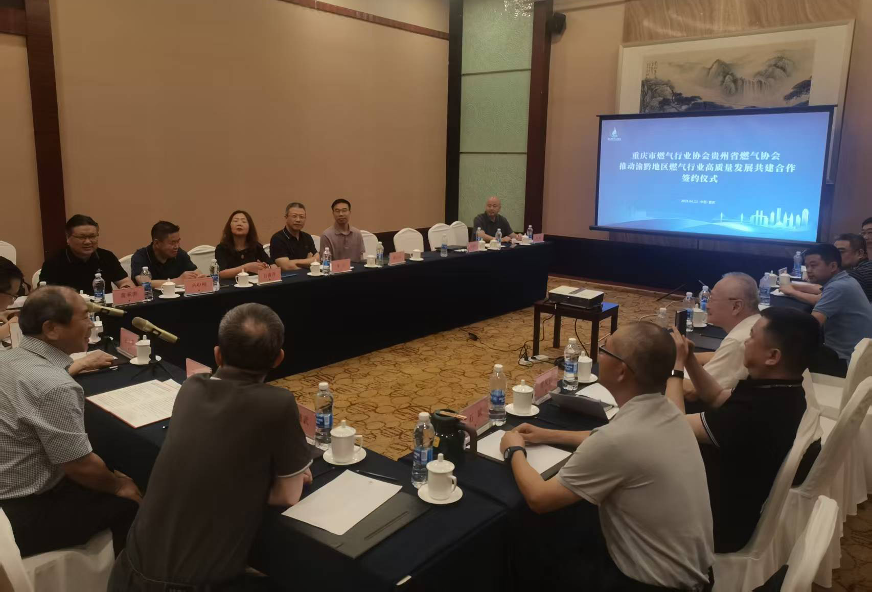 重庆市燃气行业协会与贵州省燃气协会推动渝黔地区燃气行业高质量发展共建合作协议书 签 约 仪 式 于 2025 年 6 月 12 日 下 午17:00 点在重庆君豪大饭店 2 楼豪信厅举行,会议由重庆市燃气行业协会王颂秋理事长主持;重庆市燃气行业协会理事长王颂秋,副理事长朱江、李林、王继武、石斌、曾庆伟、黄启民、曾翔,监事娄禹光,秘书长董宁,副秘书长张炼及秘书处全体人员等出席了签字仪式;贵州省燃气协会理事长白大勇、秘书长广宏、副秘书长黄承洪、余中刚和安委会主任吕燕萍出席了签约仪式。