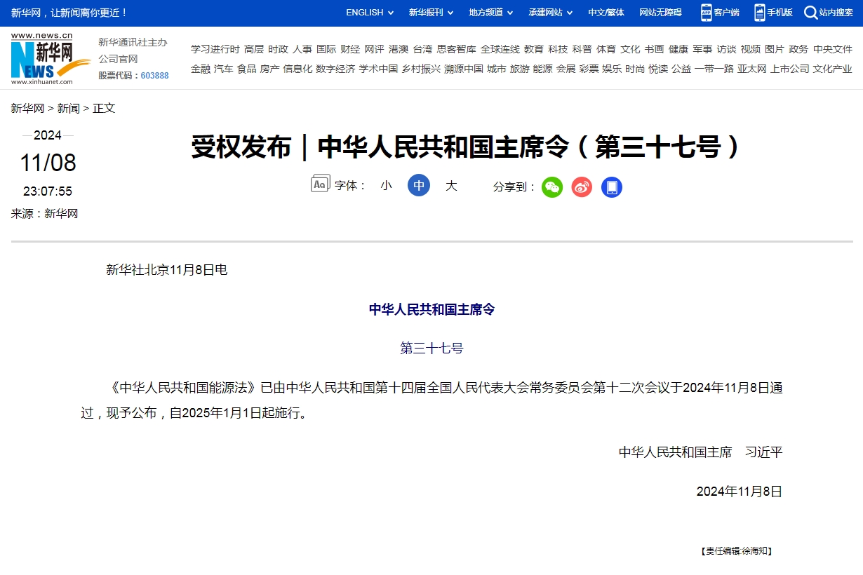 我国有了能源法!2025年1月1日起施行