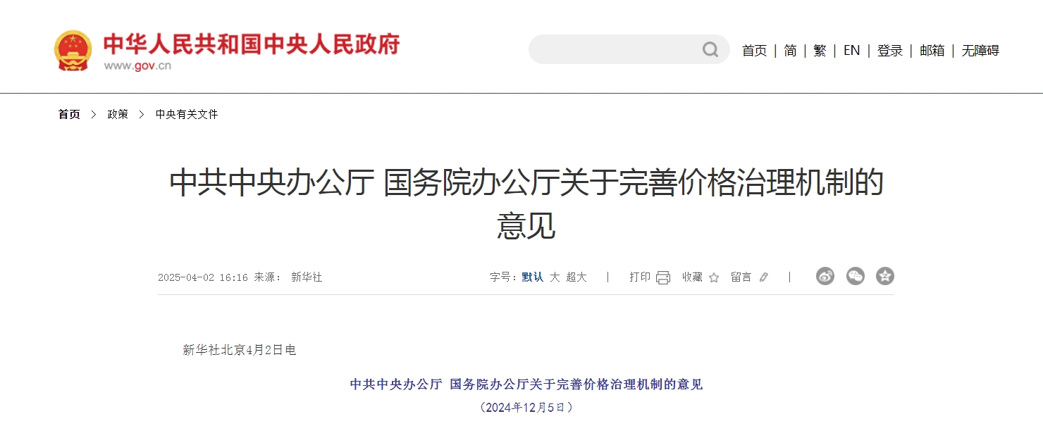 中共中央办公厅 国务院办公厅关于完善价格治理机制的意见