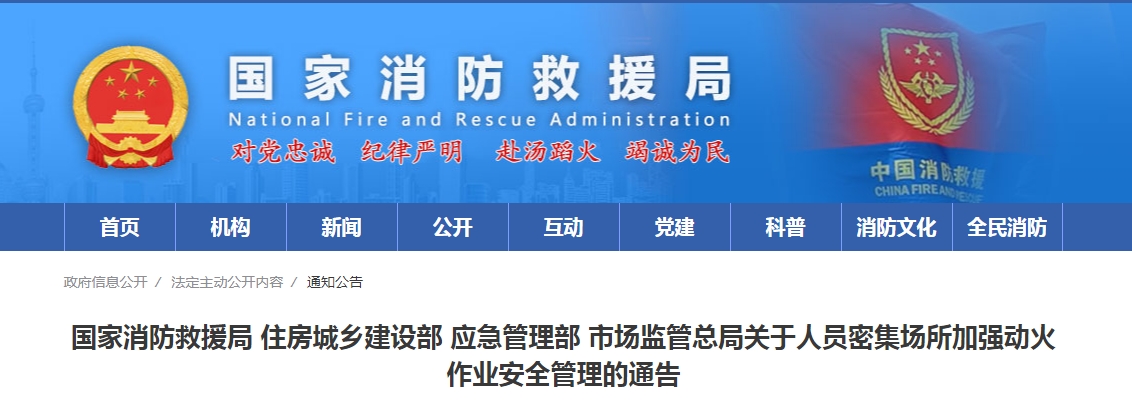 国家消防救援局 住房城乡建设部 应急管理部 市场监管总局关于人员密集场所加强动火作业安全管理的通告