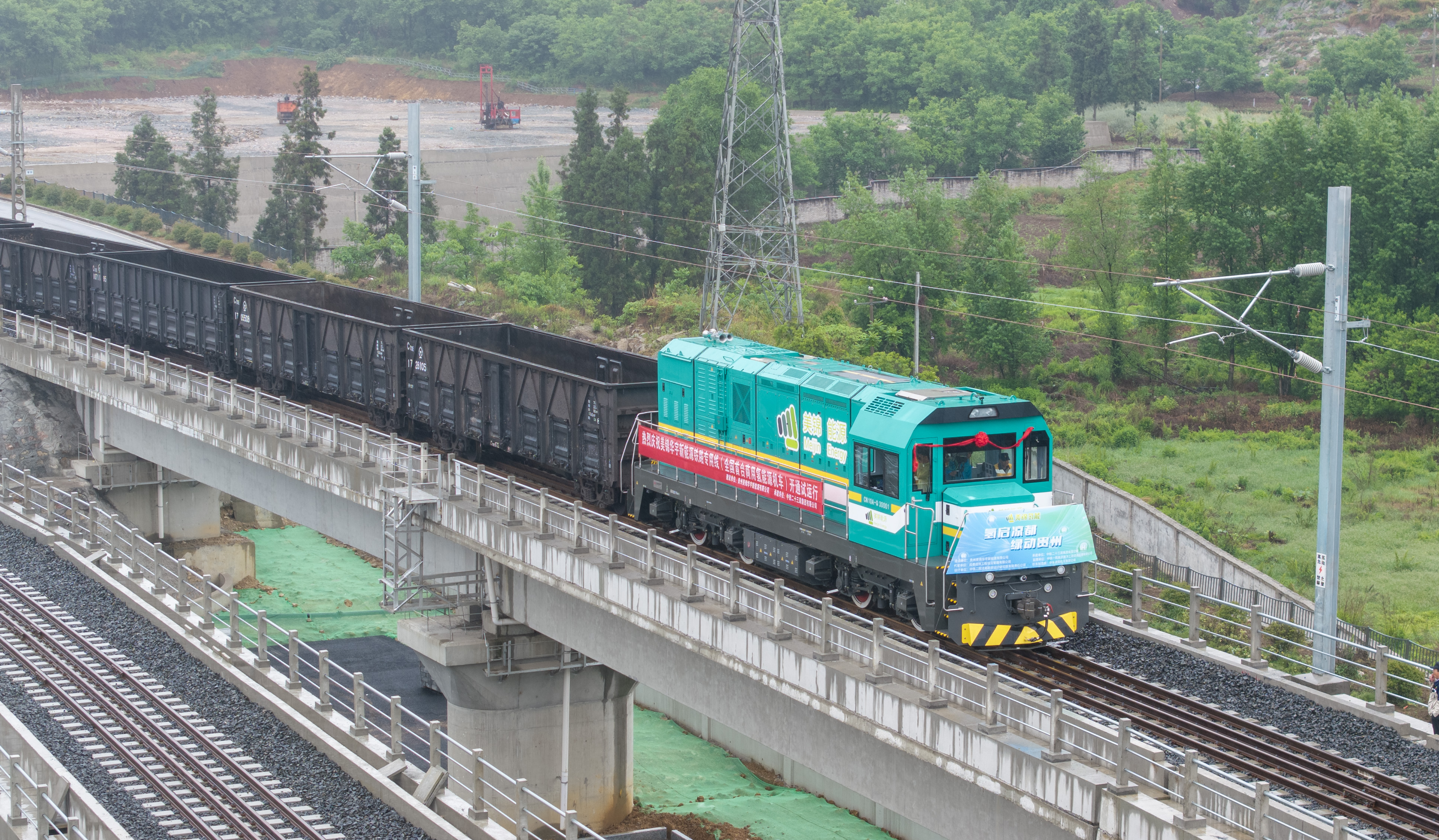 5月10日,在六盘水市六枝特区,铁路桥上,全国首台商用氢能机车头试运行;铁路桥下,49吨级氢能重卡车队正在通过。