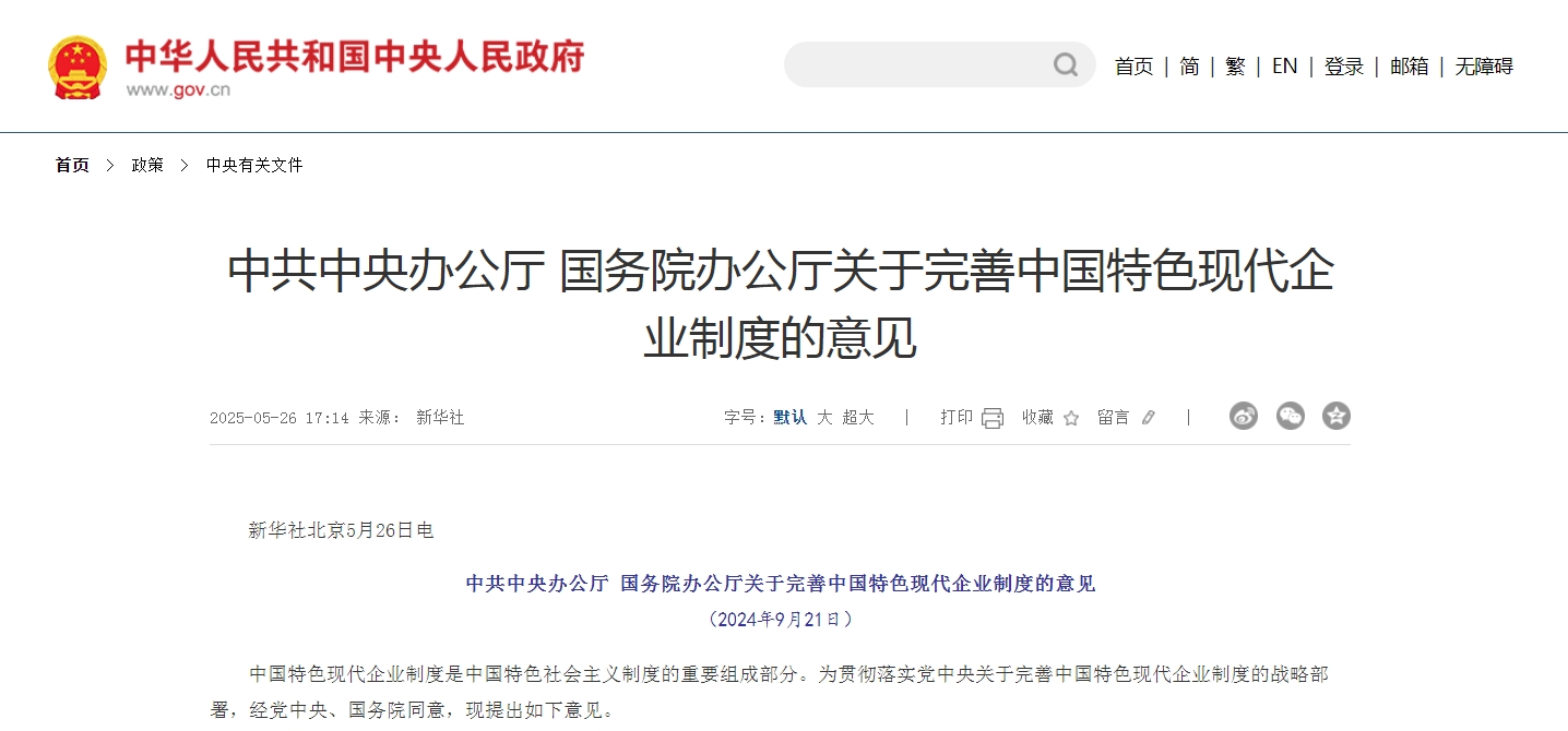 中国特色现代企业制度是中国特色社会主义制度的重要组成部分。为贯彻落实党中央关于完善中国特色现代企业制度的战略部署,经党中央、国务院同意,现提出如下意见。