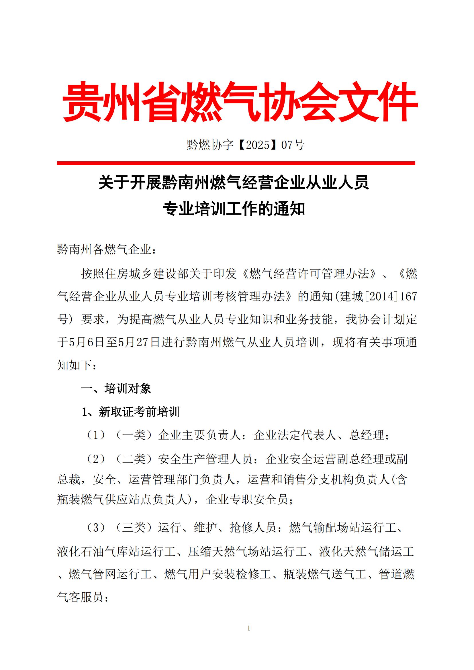 关于开展2025年黔东南州城镇燃气从业人员取证考 试考前培训及继续教育培训的通知