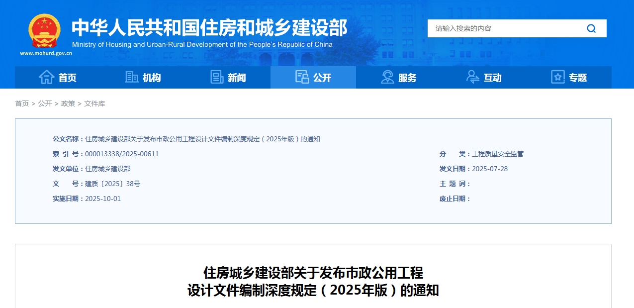 为进一步贯彻《建设工程质量管理条例》、《建设工程勘察设计管理条例》,保障市政公用工程设计质量,促进市政公用工程行业高质量发展,我部组织有关单位编制了《市政公用工程设计文件编制深度规定》(2025年版)。现予以发布,自2025年10月1日起施行。《住房城乡建设部关于发布市政公用工程设计文件编制深度规定(2013年版)的通知》(建质〔2013〕57号)同时废止。