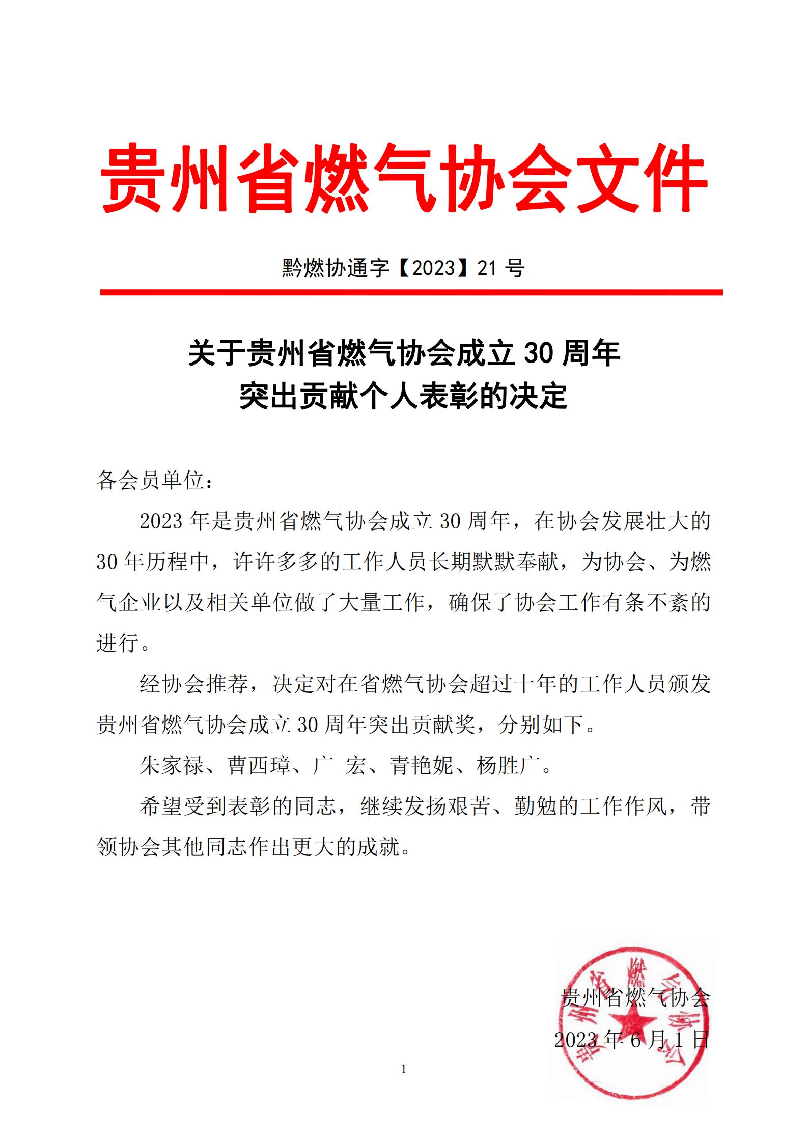 关于贵州省燃气协会成立30周年突出贡献个人表彰的决定