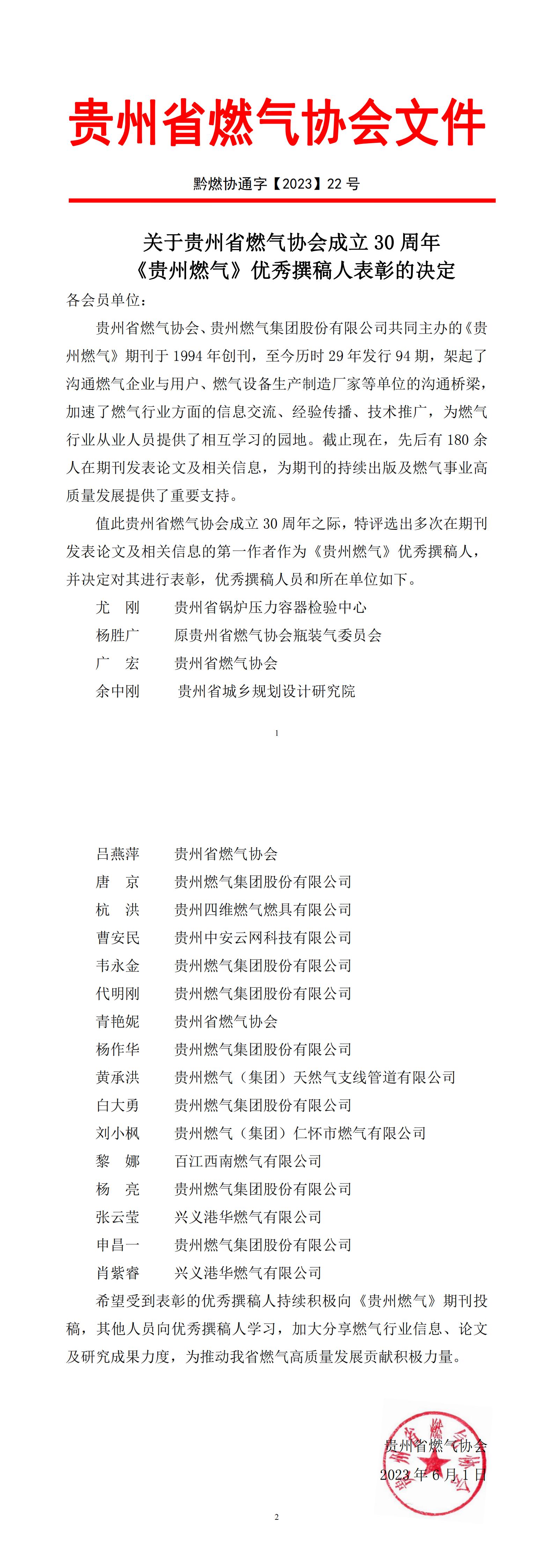 关于贵州省燃气协会成立 30 周年 《贵州燃气》优秀撰稿人表彰的决定