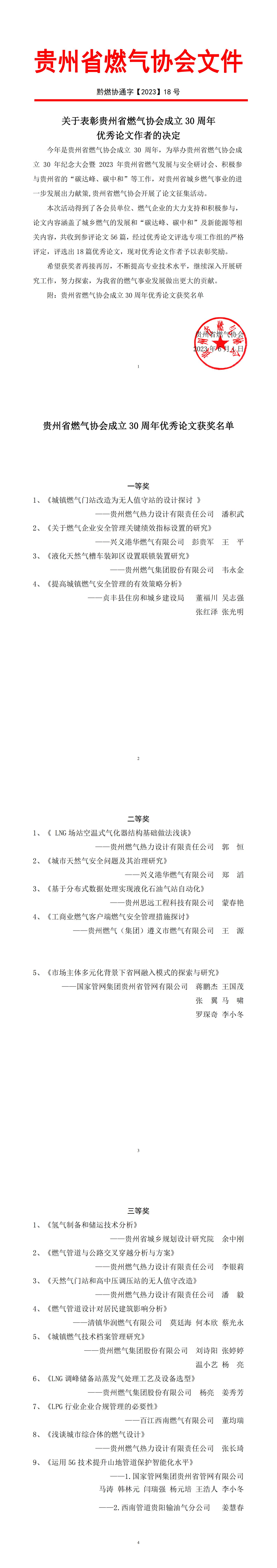 关于表彰贵州省燃气协会成立 30 周年 优秀论文作者的决定